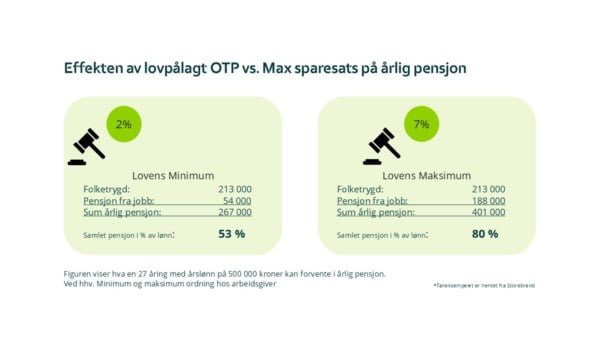 Eksempelet over fra Storebrand tar utgangspunkt i en ung person som skal jobbe til sammen i 40 år. Utregningen legger til grunn utbetaling av pensjon i 20 år. Beløpene er inflasjonsjusterte, og baserer seg på avkastningssatser som er bransjestandard. Eksemplet viser at ved å øke sparingen til 7 % av lønn, vil den ansatte gå fra en halvering av inntekten til et pensjonsnivå som i stor grad muliggjør opprettholdelse av dagens livsstil som pensjonist. De fleste vil ha noe reduserte utgifter når man er pensjonist, slik at et nivå på 80 % - 90 % av inntekten regnes som et akseptabelt nivå.