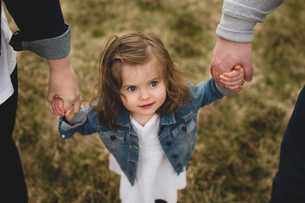 Liten jente som leies av to voksne
